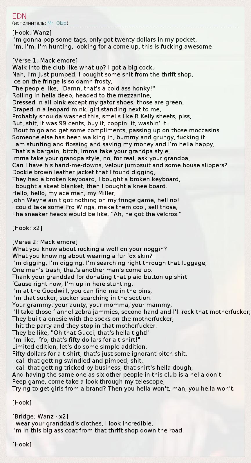 [Хук: Wanz] Я тут собираюсь маленько приодеться, но в кармане только двадцать долларов, И я, я, я, будто старатель, выискивающий золото, это просто о**ительно! [Куплет 1: Macklemore] Захожу в клуб, чего тут новенького? У меня большой х**н. Да не, это я шутканул, я просто прибарахлился в комиссионке, Камушки по краям, это вообщё ништяк, Народ такой: "Блин, реально чёткий белый пацан!" Я пробираюсь сквозь толпу, иду в бельэтаж, Одетый во всё розовое, кроме ботинок из крокодила – они зелёные, Рядом со мной стоит девчонка, на мне шуба леопардового меха, Наверное, надо было постирать её, а то от неё несёт сс**ами, как от простыней Ар Келли, 1 Да, на х**, зато всего 99 центов: выбрал, оплатил, состирнул. Ещё скажите спасибо, что не купил мокасины: В них до меня уже кто-то ходил, поэтому они загаженные и вонючие, ну их на х**! Я модный и стильный, ещё и денег сэкономил, так что радости полные штаны, Это удачное вложение денег, с**а; я позаимствую стиль у твоего дедули, Я позаимствую стиль у твоего дедули, не, серьёзно, там порасспрашивай его: Отдаст он мне свои старые тряпки, велюровый комбез и какие-нибудь тапки? Ещё я откопал какашечно-коричневый кожаный куртец, Там у них был сломанный синтезатор, ну, я и его купил, Взял простынку для д**чки, потом ещё ниборд. 2 Мои приветы крутому парняге Миллеру, Бахрома Джона Уэйна с моей даже рядом не свисала! 3 Я могу купить дешёвые шузы, раскрутить их и продать подороже, И все фаны кроссовок обалдеют: "Ух ты, они у него на липучках!" [Хук: x2] [Куплет 2: Macklemore] Что ты можешь понимать в ношении шкуры волка на голове? Что ты знаешь об облачении в лисий мех? Я ищу, я роюсь, я ворошу все эти кипы, Что для одного мусор, для другого – сокровище. Спасибо твоему дедушке за клетчатую рубашку на пуговках, Я теперь буду рассекать в ней. Сейчас я в "Гудвилле", 4 роюсь в кучах тряпья, Можешь звать меня лохом, но лохом, который прошуршал весь отдел. У твоих бабуси, тетушки, мамочки и няньки Я возьму фланелевые пижамы с узором зебры, пускай это секонд-хэнд, зато обос**ться, как модно, К тому же, они образуют комплект с носками, Я жгу на вечеринке в этом о**енительном наряде и, вдруг все останавливаются, И такие: "Ух ты, Гуччи, вообще шикарно!" А я: "Да вы чё? Пятьдесят баксов за футболку!" Типа ограниченная серия; давайте проведём несложные вычисления: Платить пятьдесят долларов за футболку – это пи**ец, как тупо. Это грабёж и надувательство, Вас просто обведут вокруг пальца, за такую-то цену, Да в придачу ещё шесть чуваков в клубе точно в таких же, это ни фига не круто. Давай играть в гляделки, посмотри в мой телескоп, Пытаешься склеить девок модными брендами? Ни фига не выйдет, чел, ни фига не выйдет. [Хук] [Переход: Wanz - x2] Я одет, как твой дед и выгляжу потрясно, Я в здоровенном пиджаке из комиссионки, что вниз по улице. [Хук] * – Thrift shop – розничный магазин, управляемый благотворительной организацией или группой активистов с целью привлечения средств на конкретную цель, однако, жителям СНГ более близко понятие "комиссионного магазина", поэтому я считаю возможной замену транслатемы. 1 – В феврале 2002 года было опубликовано порнографическое видео с урофилическим уклоном с участием r'n'b-певца R.Kelly и несовершеннолетней девушки. 2 – Особая, короткая и широкая, доска для сёрфинга; на ней катаются, стоя на коленях. 3 – Джон Уэйн – американский киноактёр, звезда вестернов. Непременным атрибутом ковбоя с