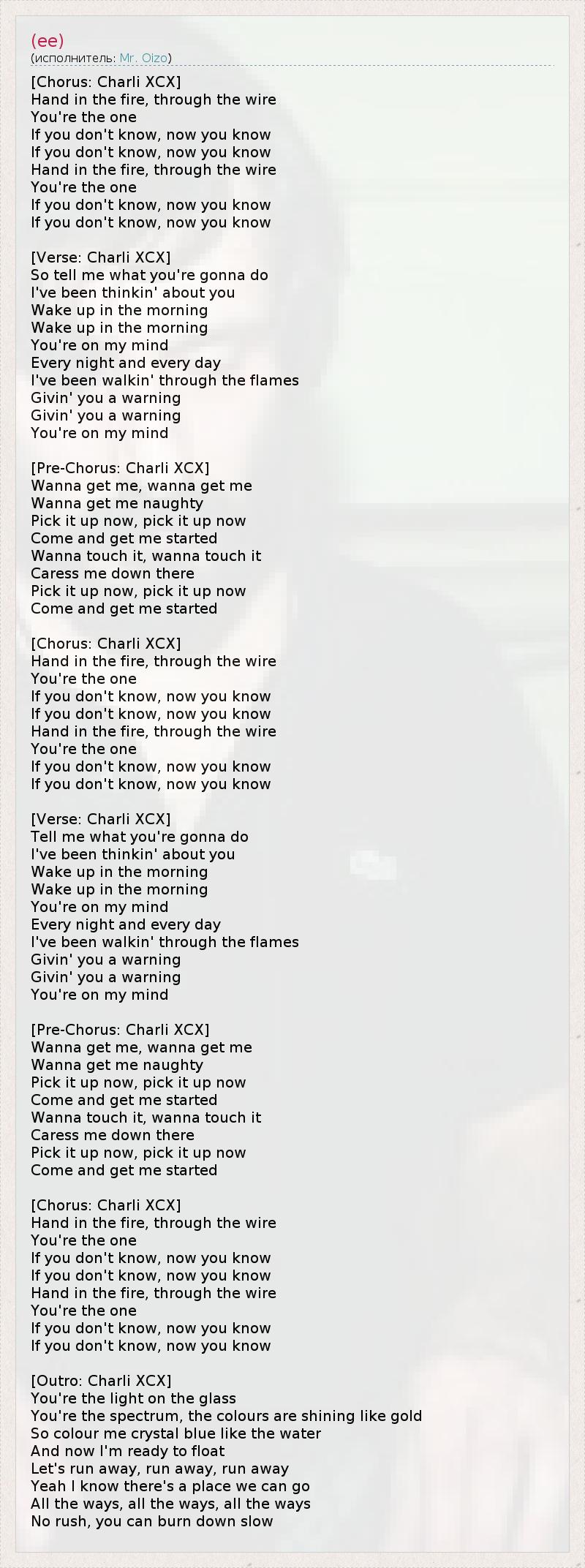 [Припев: Charli XCX] Обжигая руки, я многое преодолела. 1 Ты единственный, Если ты не знал, то теперь знаешь. Если ты не знал, то теперь знаешь. Обжигая руки, я многое преодолела. Ты единственный, Если ты не знал, то теперь знаешь. Если ты не знал, то теперь знаешь. [Куплет: Charli XCX] Так скажи мне, что ты будешь делать. Я думала о тебе, Просыпаясь утром, Просыпаясь утром. Ты в моих мыслях Каждую ночь и каждый день. Я проходила сквозь пламя, Предупреждая тебя, Предупреждая тебя. Ты в моих мыслях. [Распевка: Charli XCX] Хочешь, хочешь, Хочешь, чтобы я стала игривой. Подкатывай сейчас же, подкатывай прямо сейчас. Приезжай и возьмись за дело. Хочу прикосновений, хочу прикосновений. Приласкай меня там внизу. Подкатывай сейчас же, подкатывай прямо сейчас. Приезжай и возьмись за дело. [Припев: Charli XCX] Обжигая руки, я многое преодолела. Ты единственный, Если ты не знал, то теперь знаешь. Если ты не знал, то теперь знаешь. Обжигая руки, я многое преодолела. Ты единственный, Если ты не знал, то теперь знаешь. Если ты не знал, то теперь знаешь. [Куплет: Charli XCX] Так скажи мне, что ты будешь делать. Я думала о тебе, Просыпаясь утром, Просыпаясь утром. Ты в моих мыслях Каждую ночь и каждый день. Я проходила сквозь пламя, Предупреждая тебя, Предупреждая тебя. Ты в моих мыслях. [Распевка: Charli XCX] Хочешь, хочешь, Хочешь, что бы я стала игривой. Подкатывай сейчас же, подкатывай прямо сейчас. Приезжай и возьмись за дело. Хочу прикосновений, хочу прикосновений. Приласкай меня там внизу. Подкатывай сейчас же, подкатывай прямо сейчас. Приезжай и возьмись за дело. [Припев: Charli XCX] Обжигая руки, я многое преодолела. Ты единственный, Если ты не знал, то теперь знаешь. Если ты не знал, то теперь знаешь. Обжигая руки, я многое преодолела. Ты единственный, Если ты не знал, то теперь знаешь. Если ты не знал, то теперь знаешь. [Концовка: Charli XCX] Ты свет на стакане, Ты спектр, в котором цвета сверкают, как золото. Так что окрась меня в прозрачно-голубой цвет воды - И вот я готова плыть. Давай убежим прочь, убежим, убежим. Даа, я знаю, есть место, куда мы сможем уйти. Навсегда, навсегда, навсегда. Не торопись, ты можешь медленно сгореть дотла. 1 - Фраза "through the wire" означает "пройти через трудности", "преодолевать жизненные препятствия, не имея надежды". Фразой "Hand in the fire" (рука в огне) исполнительница усиливает значение фразы "through the wire", подчеркивая, что ей пришлось преодолеть колоссальные трудности в жизни.