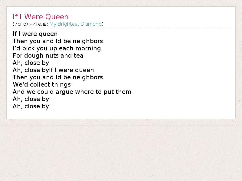 А как ты думаешь, о чем песня "If I Were Queen" ?
