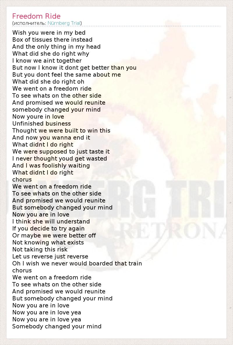 Wish you were in my bed Box of tissues there instead And the only thing in my head What did she do right why I know we aint together But now I know it dont get better than you But you dont feel the same about me What did she do right oh We went on a freedom ride To see whats on the other side And promised we would reunite somebody changed your mind Now youre in love Unfinished business Thought we were built to win this And now you wanna end it What didnt I do right We were supposed to just taste it I never thought youd get wasted And I was foolishly waiting What didnt I do right chorus We went on a freedom ride To see whats on the other side And promised we would reunite But somebody changed your mind Now you are in love I think she will understand If you decide to try again Or maybe we were better off Not knowing what exists Not taking this risk Let us reverse just reverse Oh I wish we never would boarded that train chorus We went on a freedom ride To see whats on the other side And promised we would reunite But somebody changed your mind Now you are in love Now you are in love yea Now you are in love yea Somebody changed your mind