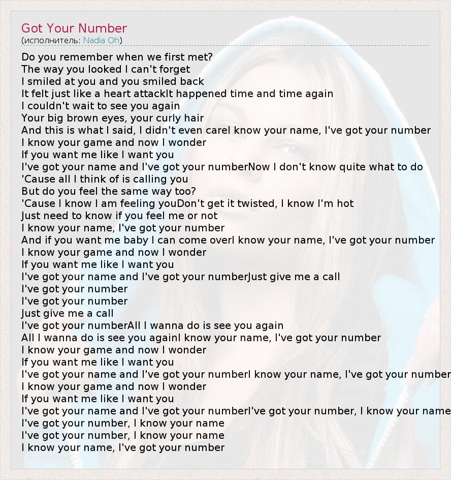 Do you remember when we first met? The way you looked I can't forget I smiled at you and you smiled back It felt just like a heart attackIt happened time and time again I couldn't wait to see you again Your big brown eyes, your curly hair And this is what I said, I didn't even careI know your name, I've got your number I know your game and now I wonder If you want me like I want you I've got your name and I've got your numberNow I don't know quite what to do 'Cause all I think of is calling you But do you feel the same way too? 'Cause I know I am feeling youDon't get it twisted, I know I'm hot Just need to know if you feel me or not I know your name, I've got your number And if you want me baby I can come overI know your name, I've got your number I know your game and now I wonder If you want me like I want you I've got your name and I've got your numberJust give me a call I've got your number I've got your number Just give me a call I've got your numberAll I wanna do is see you again All I wanna do is see you againI know your name, I've got your number I know your game and now I wonder If you want me like I want you I've got your name and I've got your numberI know your name, I've got your number I know your game and now I wonder If you want me like I want you I've got your name and I've got your numberI've got your number, I know your name I've got your number, I know your name I've got your number, I know your name I know your name, I've got your number