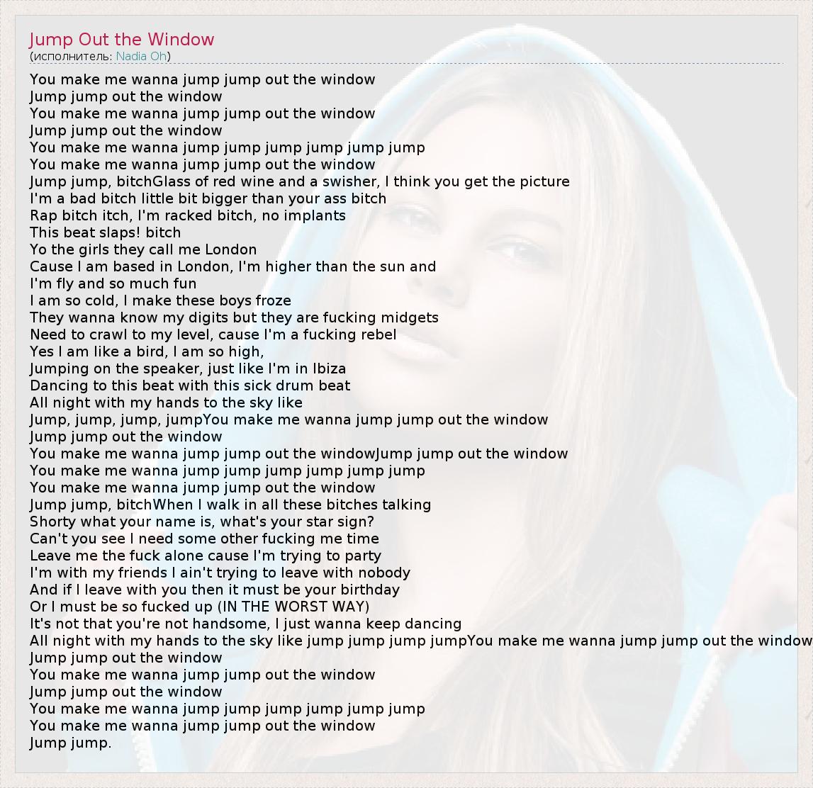 You make me wanna jump jump out the window Jump jump out the window You make me wanna jump jump out the window Jump jump out the window You make me wanna jump jump jump jump jump jump You make me wanna jump jump out the window Jump jump, bitchGlass of red wine and a swisher, I think you get the picture I'm a bad bitch little bit bigger than your ass bitch Rap bitch itch, I'm racked bitch, no implants This beat slaps! bitch Yo the girls they call me London Cause I am based in London, I'm higher than the sun and I'm fly and so much fun I am so cold, I make these boys froze They wanna know my digits but they are fucking midgets Need to crawl to my level, cause I'm a fucking rebel Yes I am like a bird, I am so high, Jumping on the speaker, just like I'm in Ibiza Dancing to this beat with this sick drum beat All night with my hands to the sky like Jump, jump, jump, jumpYou make me wanna jump jump out the window Jump jump out the window You make me wanna jump jump out the windowJump jump out the window You make me wanna jump jump jump jump jump jump You make me wanna jump jump out the window Jump jump, bitchWhen I walk in all these bitches talking Shorty what your name is, what's your star sign? Can't you see I need some other fucking me time Leave me the fuck alone cause I'm trying to party I'm with my friends I ain't trying to leave with nobody And if I leave with you then it must be your birthday Or I must be so fucked up (IN THE WORST WAY) It's not that you're not handsome, I just wanna keep dancing All night with my hands to the sky like jump jump jump jumpYou make me wanna jump jump out the window Jump jump out the window You make me wanna jump jump out the window Jump jump out the window You make me wanna jump jump jump jump jump jump You make me wanna jump jump out the window Jump jump.