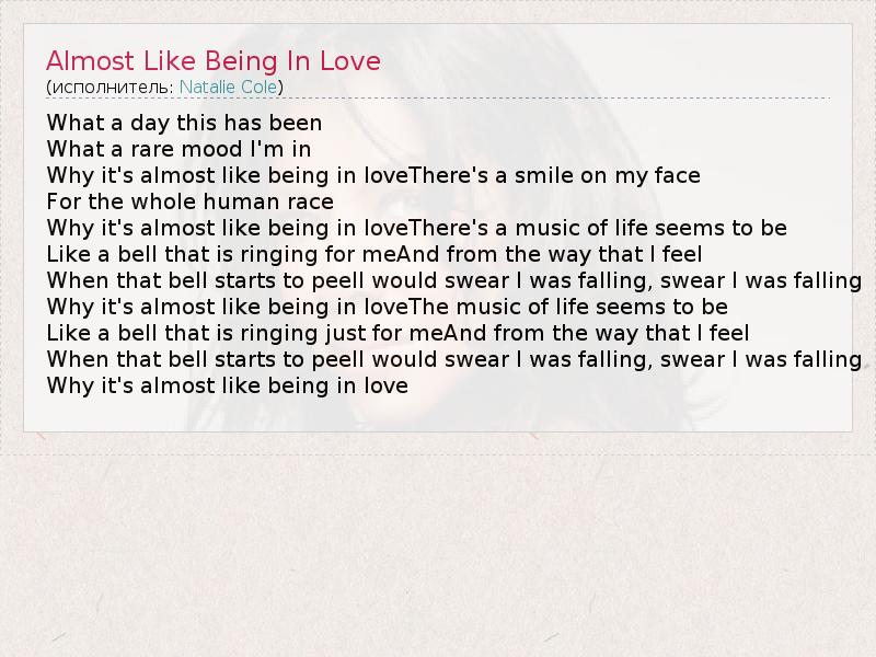 А как ты думаешь, о чем песня "Almost Like Being In Love" ?