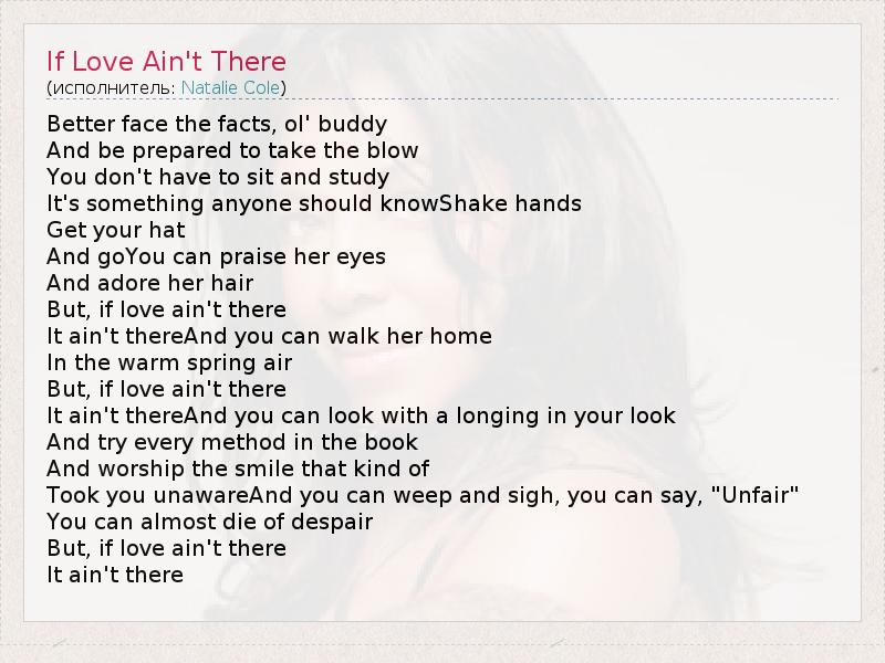 Better face the facts, ol' buddy And be prepared to take the blow You don't have to sit and study It's something anyone should knowShake hands Get your hat And goYou can praise her eyes And adore her hair But, if love ain't there It ain't thereAnd you can walk her home In the warm spring air But, if love ain't there It ain't thereAnd you can look with a longing in your look And try every method in the book And worship the smile that kind of Took you unawareAnd you can weep and sigh, you can say, "Unfair" You can almost die of despair But, if love ain't there It ain't there