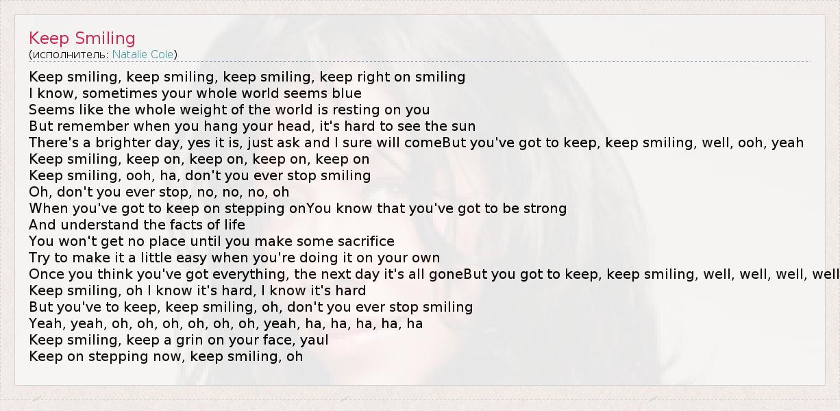 But you've to keep, keep smiling, oh, don't you ever stop smiling