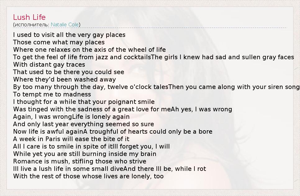 Это интересно:Несмотря на то, что Натали Коул является дочерью знаменитого певца Nat ''King'' Cole, она начала заниматься пением, только после поступления в Университет Штата Массачусетс.Натали начинала свою музыкальную карьеру, с того что писала песни, помимо этого таланта, она была великолепной пианисткой, пела вместе с Chuck Jackson и Marvin Yancy. Их музыка была смесью из различных музыкальных... продолжение