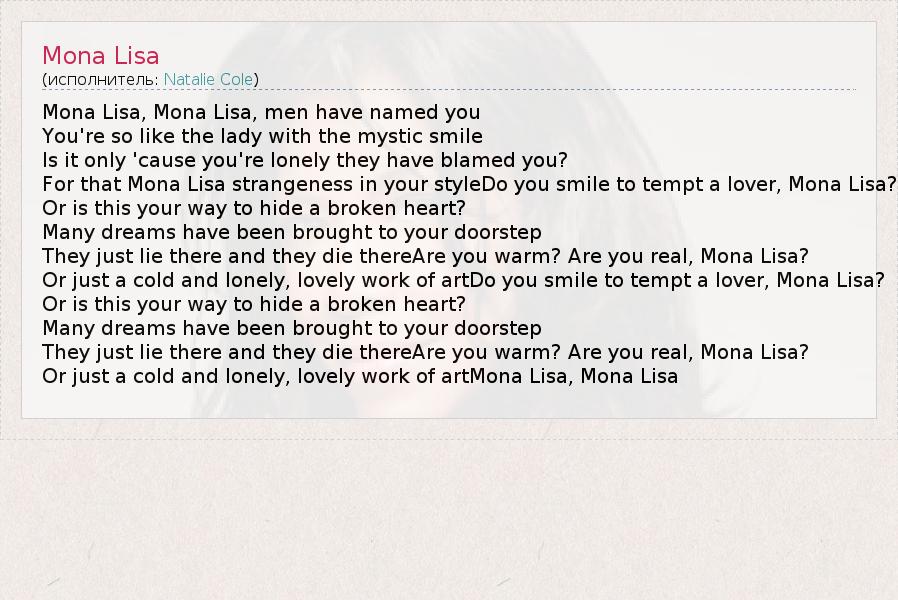 А как ты думаешь, о чем песня "Mona Lisa" ?