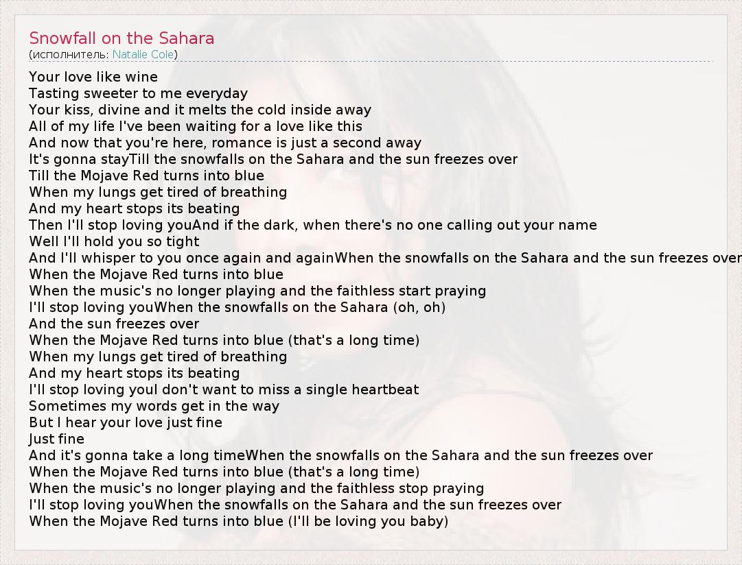 And I'll whisper to you once again and againWhen the snowfalls on the Sahara and the sun freezes over