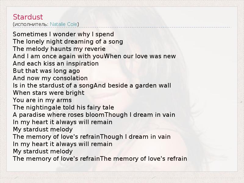 Sometimes I wonder why I spend The lonely night dreaming of a song The melody haunts my reverie And I am once again with youWhen our love was new And each kiss an inspiration But that was long ago And now my consolation Is in the stardust of a songAnd beside a garden wall When stars were bright You are in my arms The nightingale told his fairy tale A paradise where roses bloomThough I dream in vain In my heart it always will remain My stardust melody The memory of love's refrainThough I dream in vain In my heart it always will remain My stardust melody The memory of love's refrainThe memory of love's refrain