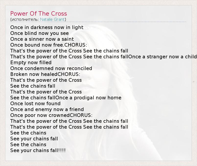 Once in darkness now in light Once blind now you see Once a sinner now a saint Once bound now free.CHORUS: That's the power of the Cross See the chains fall That's the power of the Cross See the chains fallOnce a stranger now a child Empty now filled Once condemned now reconciled Broken now healedCHORUS: That's the power of the Cross See the chains fall That's the power of the Cross See the chains fallOnce a prodigal now home Once lost now found Once and enemy now a friend Once poor now crownedCHORUS: That's the power of the Cross See the chains fall That's the power of the Cross See the chains fall See the chains See your chains fall See the chains See your chains fall!!!!