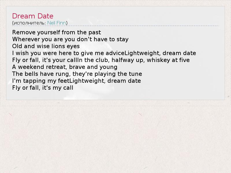 Remove yourself from the past Wherever you are you don't have to stay Old and wise lions eyes I wish you were here to give me adviceLightweight, dream date Fly or fall, it's your callIn the club, halfway up, whiskey at five A weekend retreat, brave and young The bells have rung, they're playing the tune I'm tapping my feetLightweight, dream date Fly or fall, it's my call