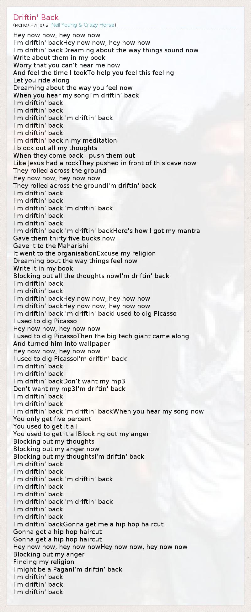 Hey now now, hey now now I'm driftin' backHey now now, hey now now I'm driftin' backDreaming about the way things sound now Write about them in my book Worry that you can't hear me now And feel the time I tookTo help you feel this feeling Let you ride along Dreaming about the way you feel now When you hear my songI'm driftin' back I'm driftin' back I'm driftin' back I'm driftin' backI'm driftin' back I'm driftin' back I'm driftin' back I'm driftin' backIn my meditation I block out all my thoughts When they come back I push them out Like Jesus had a rockThey pushed in front of this cave now They rolled across the ground Hey now now, hey now now They rolled across the groundI'm driftin' back I'm driftin' back I'm driftin' back I'm driftin' backI'm driftin' back I'm driftin' back I'm driftin' back I'm driftin' backI'm driftin' backHere's how I got my mantra Gave them thirty five bucks now Gave it to the Maharishi It went to the organisationExcuse my religion Dreaming bout the way things feel now Write it in my book Blocking out all the thoughts nowI'm driftin' back I'm driftin' back I'm driftin' back I'm driftin' backHey now now, hey now now I'm driftin' backHey now now, hey now now I'm driftin' backI'm driftin' backI used to dig Picasso I used to dig Picasso Hey now now, hey now now I used to dig PicassoThen the big tech giant came along And turned him into wallpaper Hey now now, hey now now I used to dig PicassoI'm driftin' back I'm driftin' back I'm driftin' back I'm driftin' backDon't want my mp3 Don't want my mp3I'm driftin' back I'm driftin' back I'm driftin' back I'm driftin' backI'm driftin' backWhen you hear my song now You only get five percent You used to get it all You used to get it allBlocking out my anger Blocking out my thoughts Blocking out my anger now Blocking out my thoughtsI'm driftin' back I'm driftin' back I'm driftin' back I'm driftin' backI'm driftin' back I'm driftin' back I'm driftin' back I'm driftin' backI'm driftin' back I'm driftin' back I'm driftin' back I'm driftin' backGonna get me a hip hop haircut Gonna get a hip hop haircut Gonna get a hip hop haircut Hey now now, hey now nowHey now now, hey now now Blocking out my anger Finding my religion I might be a PaganI'm driftin' back I'm driftin' back I'm driftin' back I'm driftin' back