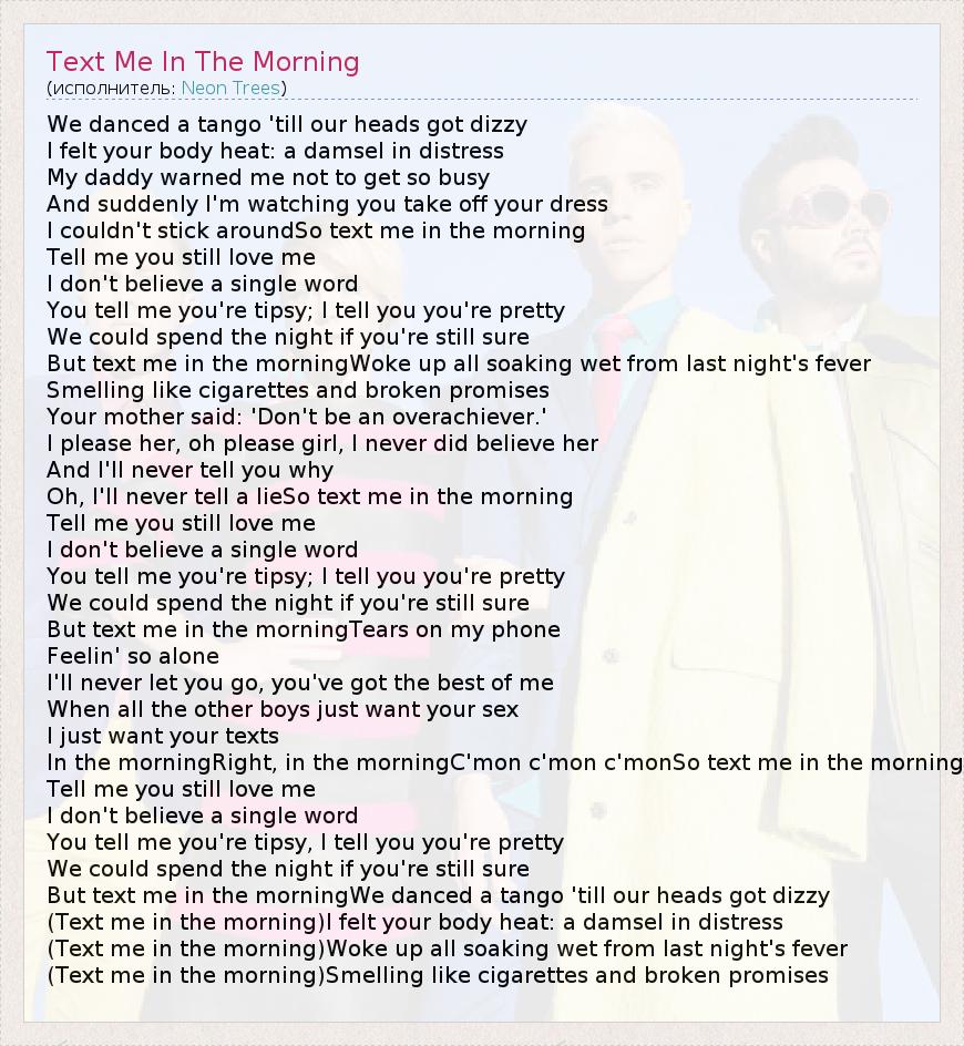 We danced a tango 'till our heads got dizzy I felt your body heat: a damsel in distress My daddy warned me not to get so busy And suddenly I'm watching you take off your dress I couldn't stick aroundSo text me in the morning Tell me you still love me I don't believe a single word You tell me you're tipsy; I tell you you're pretty We could spend the night if you're still sure But text me in the morningWoke up all soaking wet from last night's fever Smelling like cigarettes and broken promises Your mother said: 'Don't be an overachiever.' I please her, oh please girl, I never did believe her And I'll never tell you why Oh, I'll never tell a lieSo text me in the morning Tell me you still love me I don't believe a single word You tell me you're tipsy; I tell you you're pretty We could spend the night if you're still sure But text me in the morningTears on my phone Feelin' so alone I'll never let you go, you've got the best of me When all the other boys just want your sex I just want your texts In the morningRight, in the morningC'mon c'mon c'monSo text me in the morning Tell me you still love me I don't believe a single word You tell me you're tipsy, I tell you you're pretty We could spend the night if you're still sure But text me in the morningWe danced a tango 'till our heads got dizzy (Text me in the morning)I felt your body heat: a damsel in distress (Text me in the morning)Woke up all soaking wet from last night's fever (Text me in the morning)Smelling like cigarettes and broken promises