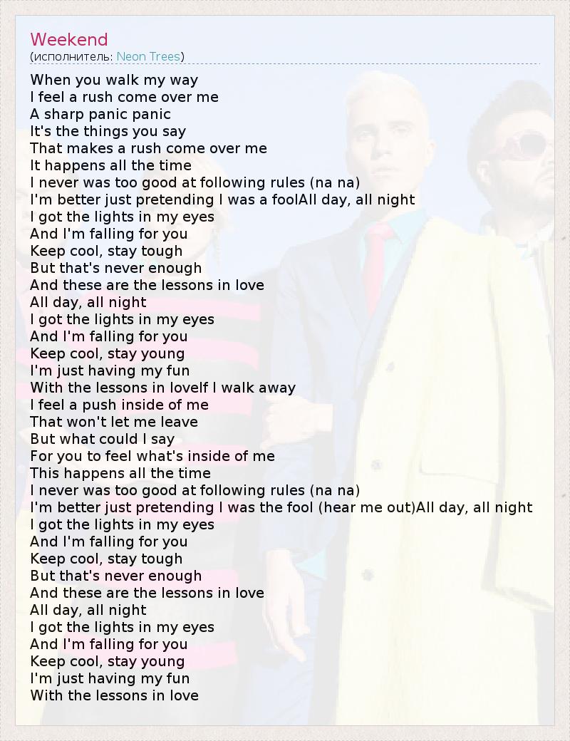 When you walk my way I feel a rush come over me A sharp panic panic It's the things you say That makes a rush come over me It happens all the time I never was too good at following rules (na na) I'm better just pretending I was a foolAll day, all night I got the lights in my eyes And I'm falling for you Keep cool, stay tough But that's never enough And these are the lessons in love All day, all night I got the lights in my eyes And I'm falling for you Keep cool, stay young I'm just having my fun With the lessons in loveIf I walk away I feel a push inside of me That won't let me leave But what could I say For you to feel what's inside of me This happens all the time I never was too good at following rules (na na) I'm better just pretending I was the fool (hear me out)All day, all night I got the lights in my eyes And I'm falling for you Keep cool, stay tough But that's never enough And these are the lessons in love All day, all night I got the lights in my eyes And I'm falling for you Keep cool, stay young I'm just having my fun With the lessons in love