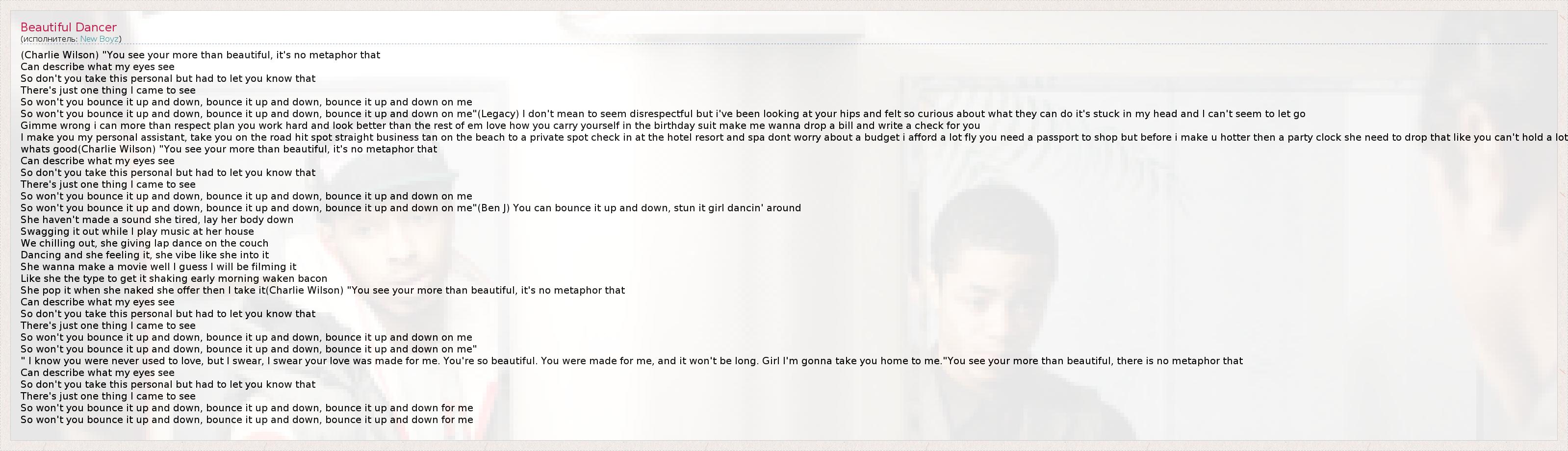 (Charlie Wilson) "You see your more than beautiful, it's no metaphor that Can describe what my eyes see So don't you take this personal but had to let you know that There's just one thing I came to see So won't you bounce it up and down, bounce it up and down, bounce it up and down on me So won't you bounce it up and down, bounce it up and down, bounce it up and down on me"(Legacy) I don't mean to seem disrespectful but i've been looking at your hips and felt so curious about what they can do it's stuck in my head and I can't seem to let go Gimme wrong i can more than respect plan you work hard and look better than the rest of em love how you carry yourself in the birthday suit make me wanna drop a bill and write a check for you I make you my personal assistant, take you on the road hit spot straight business tan on the beach to a private spot check in at the hotel resort and spa dont worry about a budget i afford a lot fly you need a passport to shop but before i make u hotter then a party clock she need to drop that like you can't hold a lot whats good(Charlie Wilson) "You see your more than beautiful, it's no metaphor that Can describe what my eyes see So don't you take this personal but had to let you know that There's just one thing I came to see So won't you bounce it up and down, bounce it up and down, bounce it up and down on me So won't you bounce it up and down, bounce it up and down, bounce it up and down on me"(Ben J) You can bounce it up and down, stun it girl dancin' around She haven't made a sound she tired, lay her body down Swagging it out while I play music at her house We chilling out, she giving lap dance on the couch Dancing and she feeling it, she vibe like she into it She wanna make a movie well I guess I will be filming it Like she the type to get it shaking early morning waken bacon She pop it when she naked she offer then I take it(Charlie Wilson) "You see your more than beautiful, it's no metaphor that Can describe what my eyes see So don't you take this personal but had to let you know that There's just one thing I came to see So won't you bounce it up and down, bounce it up and down, bounce it up and down on me So won't you bounce it up and down, bounce it up and down, bounce it up and down on me" " I know you were never used to love, but I swear, I swear your love was made for me. You're so beautiful. You were made for me, and it won't be long. Girl I'm gonna take you home to me."You see your more than beautiful, there is no metaphor that Can describe what my eyes see So don't you take this personal but had to let you know that There's just one thing I came to see So won't you bounce it up and down, bounce it up and down, bounce it up and down for me So won't you bounce it up and down, bounce it up and down, bounce it up and down for me