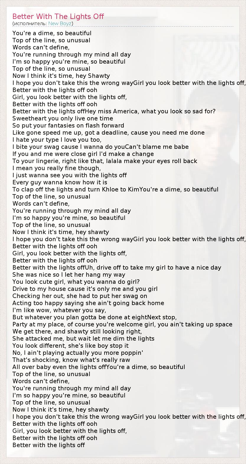 You're a dime, so beautiful Top of the line, so unusual Words can't define, You're running through my mind all day I'm so happy you're mine, so beautiful Top of the line, so unusual Now I think it's time, hey Shawty I hope you don't take this the wrong wayGirl you look better with the lights off, Better with the lights off ooh Girl, you look better with the lights off, Better with the lights off ooh Better with the lights offHey miss America, what you look so sad for? Sweetheart you only live one time So put your fantasies on flash forward Like gone speed me up, got a deadline, cause you need me done I hate your type I love you too, I bite your swag cause I wanna do youCan't blame me babe If you and me were close girl I'd make a change To your lingerie, right like that, lalala make your eyes roll back I mean you really fine though, I just wanna see you with the lights off Every guy wanna know how it is To clap off the lights and turn Khloe to KimYou're a dime, so beautiful Top of the line, so unusual Words can't define, You're running through my mind all day I'm so happy you're mine, so beautiful Top of the line, so unusual Now I think it's time, hey shawty I hope you don't take this the wrong wayGirl you look better with the lights off, Better with the lights off ooh Girl, you look better with the lights off, Better with the lights off ooh Better with the lights offUh, drive off to take my girl to have a nice day She was nice so I let her hang my way You look cute girl, what you wanna do girl? Drive to my house cause it's only me and you girl Checking her out, she had to put her swag on Acting too happy saying she ain't going back home I'm like wow, whatever you say, But whatever you plan gotta be done at eightNext stop, Party at my place, of course you're welcome girl, you ain't taking up space We get there, and shawty still looking right, She attacked me, but wait let me dim the lights You look different, she's like boy stop it No, I ain't playing actually you more poppin' That's shocking, know what's really raw All over baby even the lights offYou're a dime, so beautiful Top of the line, so unusual Words can't define, You're running through my mind all day I'm so happy you're mine, so beautiful Top of the line, so unusual Now I think it's time, hey shawty I hope you don't take this the wrong wayGirl you look better with the lights off, Better with the lights off ooh Girl, you look better with the lights off, Better with the lights off ooh Better with the lights off