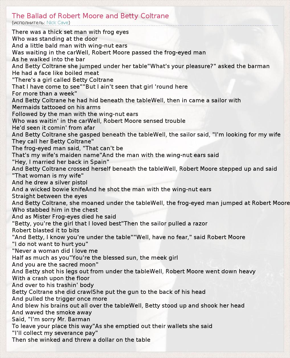 ГлавнаяИсполнителиNick CaveThe Ballad of Robert Moore and Betty Coltrane