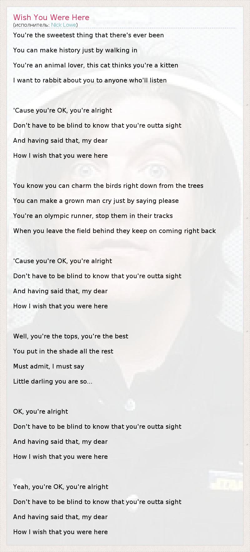 You're the sweetest thing that there's ever been You can make history just by walking in You're an animal lover, this cat thinks you're a kitten I want to rabbit about you to anyone who'll listen 'Cause you're OK, you're alright Don't have to be blind to know that you're outta sight And having said that, my dear How I wish that you were here You know you can charm the birds right down from the trees You can make a grown man cry just by saying please You're an olympic runner, stop them in their tracks When you leave the field behind they keep on coming right back 'Cause you're OK, you're alright Don't have to be blind to know that you're outta sight And having said that, my dear How I wish that you were here Well, you're the tops, you're the best You put in the shade all the rest Must admit, I must say Little darling you are so... OK, you're alright Don't have to be blind to know that you're outta sight And having said that, my dear How I wish that you were here Yeah, you're OK, you're alright Don't have to be blind to know that you're outta sight And having said that, my dear How I wish that you were here