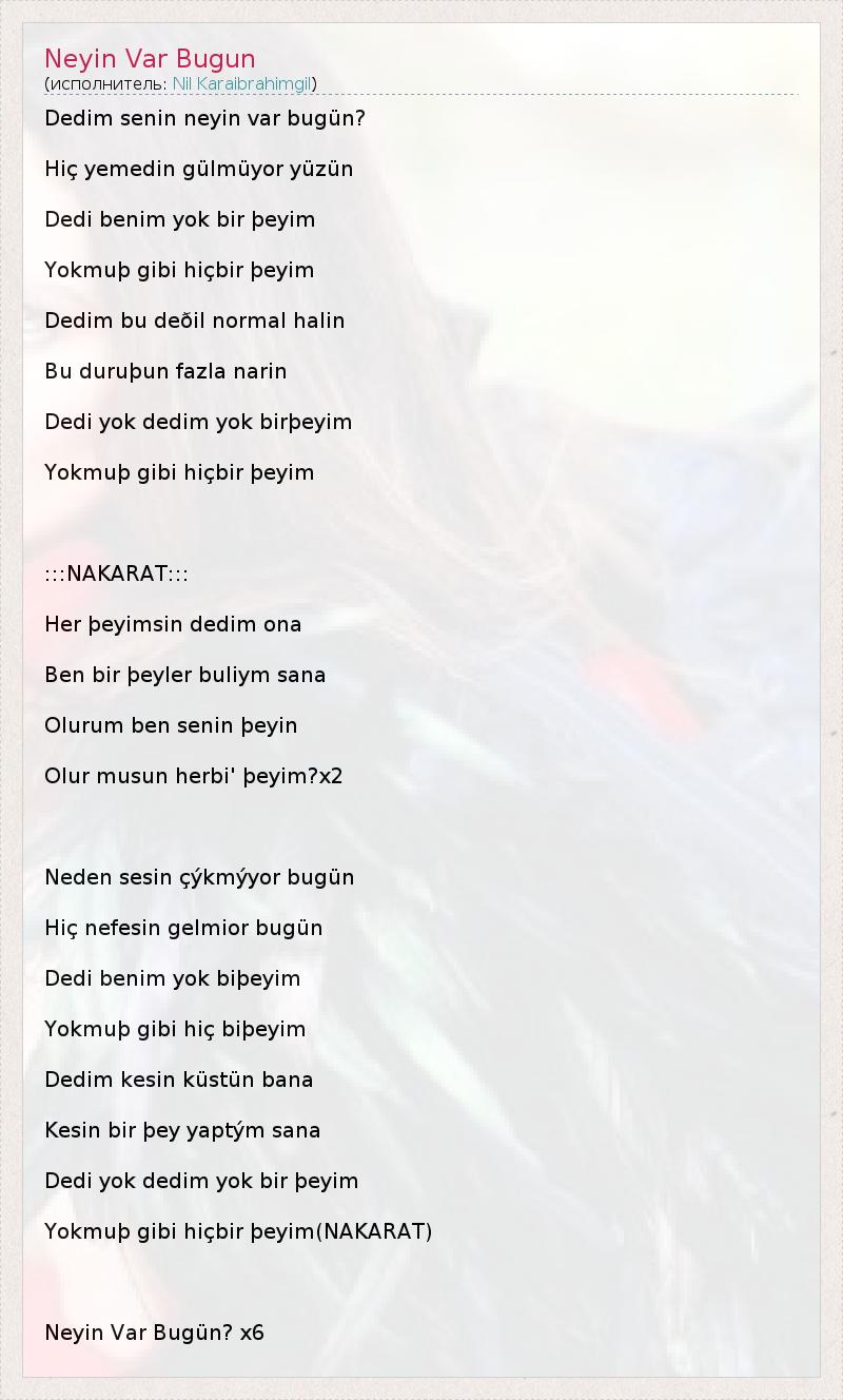 Dedim senin neyin var bugün? Hiç yemedin gülmüyor yüzün Dedi benim yok bir þeyim Yokmuþ gibi hiçbir þeyim Dedim bu deðil normal halin Bu duruþun fazla narin Dedi yok dedim yok birþeyim Yokmuþ gibi hiçbir þeyim :::NAKARAT::: Her þeyimsin dedim ona Ben bir þeyler buliym sana Olurum ben senin þeyin Olur musun herbi' þeyim?x2 Neden sesin çýkmýyor bugün Hiç nefesin gelmior bugün Dedi benim yok biþeyim Yokmuþ gibi hiç biþeyim Dedim kesin küstün bana Kesin bir þey yaptým sana Dedi yok dedim yok bir þeyim Yokmuþ gibi hiçbir þeyim(NAKARAT) Neyin Var Bugün? x6