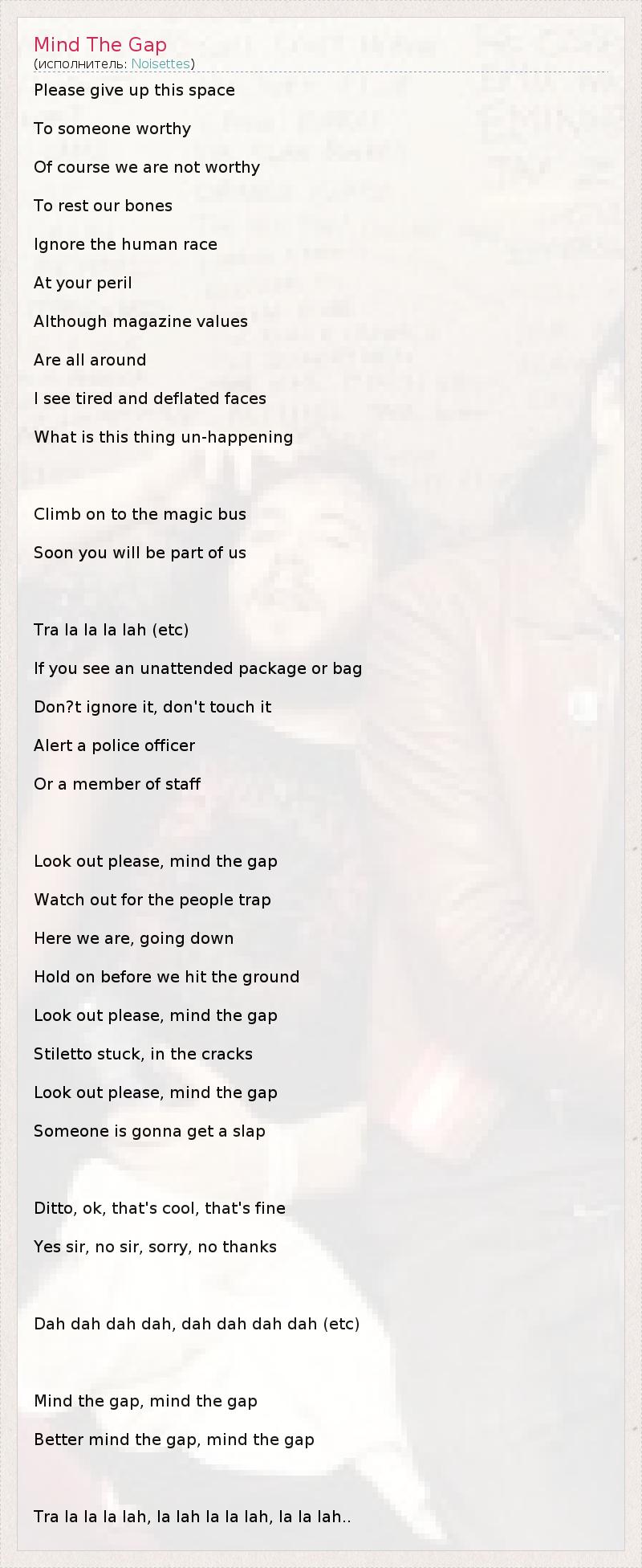 Please give up this space To someone worthy Of course we are not worthy To rest our bones Ignore the human race At your peril Although magazine values Are all around I see tired and deflated faces What is this thing un-happening Climb on to the magic bus Soon you will be part of us Tra la la la lah (etc) If you see an unattended package or bag Don?t ignore it, don't touch it Alert a police officer Or a member of staff Look out please, mind the gap Watch out for the people trap Here we are, going down Hold on before we hit the ground Look out please, mind the gap Stiletto stuck, in the cracks Look out please, mind the gap Someone is gonna get a slap Ditto, ok, that's cool, that's fine Yes sir, no sir, sorry, no thanks Dah dah dah dah, dah dah dah dah (etc) Mind the gap, mind the gap Better mind the gap, mind the gap Tra la la la lah, la lah la la lah, la la lah..