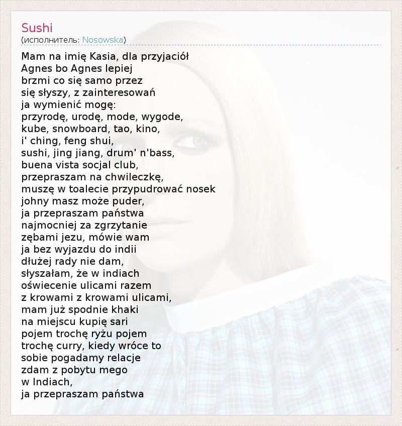 Это интересно:Kasia Nosowska - одна из ведущих польских вокалисток и одна из талантливейших авторов текстов. Как журналист пишет для журналов Filipinka, Muza, Zwierciadło. Изначально Kasia обрела известность в качестве вокалистки группы Hey, но ее сольная карьера не менее интересна. Kasia была удостоена множества наград, в том числе престижной премии польского музыкального рынка Fryderyk в номинациях "Лучшая вокалистка",... продолжение