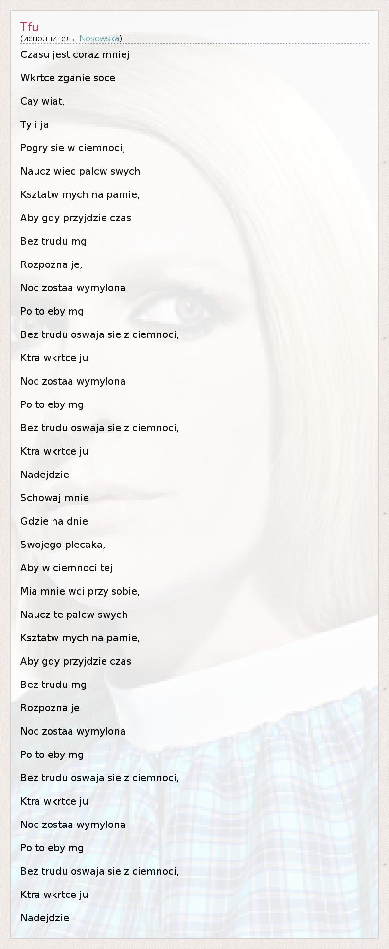 Это интересно:Kasia Nosowska - одна из ведущих польских вокалисток и одна из талантливейших авторов текстов. Как журналист пишет для журналов Filipinka, Muza, Zwierciadło. Изначально Kasia обрела известность в качестве вокалистки группы Hey, но ее сольная карьера не менее интересна. Kasia была удостоена множества наград, в том числе престижной премии польского музыкального рынка Fryderyk в номинациях "Лучшая вокалистка",... продолжение