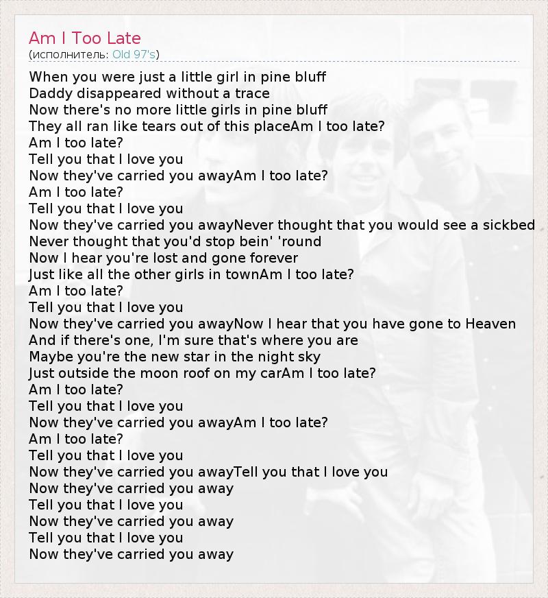 When you were just a little girl in pine bluff Daddy disappeared without a trace Now there's no more little girls in pine bluff They all ran like tears out of this placeAm I too late? Am I too late? Tell you that I love you Now they've carried you awayAm I too late? Am I too late? Tell you that I love you Now they've carried you awayNever thought that you would see a sickbed Never thought that you'd stop bein' 'round Now I hear you're lost and gone forever Just like all the other girls in townAm I too late? Am I too late? Tell you that I love you Now they've carried you awayNow I hear that you have gone to Heaven And if there's one, I'm sure that's where you are Maybe you're the new star in the night sky Just outside the moon roof on my carAm I too late? Am I too late? Tell you that I love you Now they've carried you awayAm I too late? Am I too late? Tell you that I love you Now they've carried you awayTell you that I love you Now they've carried you away Tell you that I love you Now they've carried you away Tell you that I love you Now they've carried you away