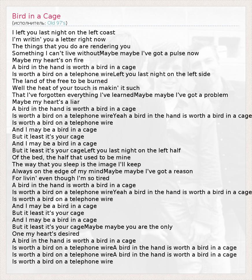 I left you last night on the left coast I'm writin' you a letter right now The things that you do are rendering you Something I can't live withoutMaybe maybe I've got a pulse now Maybe my heart's on fire A bird in the hand is worth a bird in a cage Is worth a bird on a telephone wireLeft you last night on the left side The land of the free to be burned Well the heat of your touch is makin' it such That I've forgotten everything I've learnedMaybe maybe I've got a problem Maybe my heart's a liar A bird in the hand is worth a bird in a cage Is worth a bird on a telephone wireYeah a bird in the hand is worth a bird in a cage Is worth a bird on a telephone wire And I may be a bird in a cage But it least it's your cage And I may be a bird in a cage But it least it's your cageLeft you last night on the left half Of the bed, the half that used to be mine The way that you sleep is the image I'll keep Always on the edge of my mindMaybe maybe I've got a reason For livin' even though I'm so tired A bird in the hand is worth a bird in a cage Is worth a bird on a telephone wireYeah a bird in the hand is worth a bird in a cage Is worth a bird on a telephone wire And I may be a bird in a cage But it least it's your cage And I may be a bird in a cage But it least it's your cageMaybe maybe you are the only One my heart's desired A bird in the hand is worth a bird in a cage Is worth a bird on a telephone wireA bird in the hand is worth a bird in a cage Is worth a bird on a telephone wireA bird in the hand is worth a bird in a cage Is worth a bird on a telephone wire