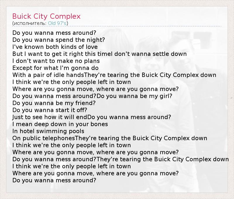 Do you wanna mess around? Do you wanna spend the night? I've known both kinds of love But I want to get it right this timeI don't wanna settle down I don't want to make no plans Except for what I'm gonna do With a pair of idle handsThey're tearing the Buick City Complex down I think we're the only people left in town Where are you gonna move, where are you gonna move? Do you wanna mess around?Do you wanna be my girl? Do you wanna be my friend? Do you wanna start it off? Just to see how it will endDo you wanna mess around? I mean deep down in your bones In hotel swimming pools On public telephonesThey're tearing the Buick City Complex down I think we're the only people left in town Where are you gonna move, where are you gonna move? Do you wanna mess around?They're tearing the Buick City Complex down I think we're the only people left in town Where are you gonna move, where are you gonna move? Do you wanna mess around?