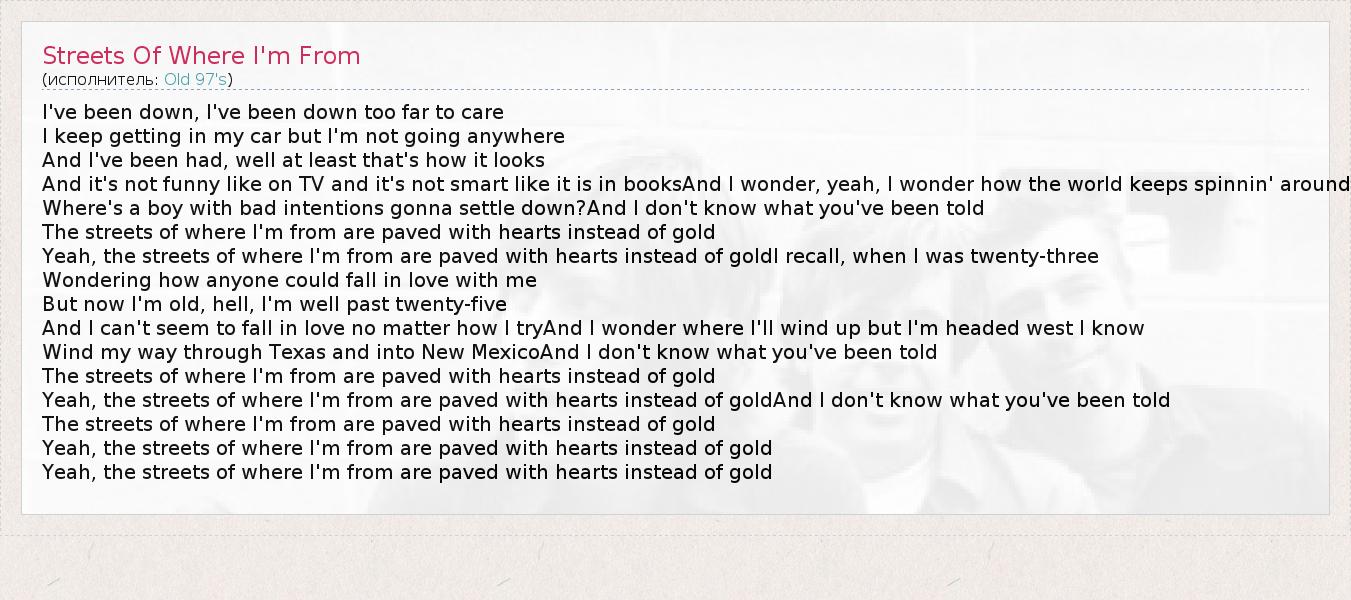 I've been down, I've been down too far to care I keep getting in my car but I'm not going anywhere And I've been had, well at least that's how it looks And it's not funny like on TV and it's not smart like it is in booksAnd I wonder, yeah, I wonder how the world keeps spinnin' around Where's a boy with bad intentions gonna settle down?And I don't know what you've been told The streets of where I'm from are paved with hearts instead of gold Yeah, the streets of where I'm from are paved with hearts instead of goldI recall, when I was twenty-three Wondering how anyone could fall in love with me But now I'm old, hell, I'm well past twenty-five And I can't seem to fall in love no matter how I tryAnd I wonder where I'll wind up but I'm headed west I know Wind my way through Texas and into New MexicoAnd I don't know what you've been told The streets of where I'm from are paved with hearts instead of gold Yeah, the streets of where I'm from are paved with hearts instead of goldAnd I don't know what you've been told The streets of where I'm from are paved with hearts instead of gold Yeah, the streets of where I'm from are paved with hearts instead of gold Yeah, the streets of where I'm from are paved with hearts instead of gold