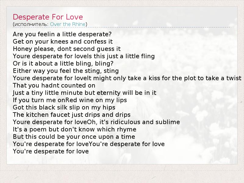 Are you feelin a little desperate? Get on your knees and confess it Honey please, dont second guess it Youre desperate for loveIs this just a little fling Or is it about a little bling, bling? Either way you feel the sting, sting Youre desperate for loveIt might only take a kiss for the plot to take a twist That you hadnt counted on Just a tiny little minute but eternity will be in it If you turn me onRed wine on my lips Got this black silk slip on my hips The kitchen faucet just drips and drips Youre desperate for loveOh, it's ridiculous and sublime It's a poem but don't know which rhyme But this could be your once upon a time You're desperate for loveYou're desperate for love You're desperate for love
