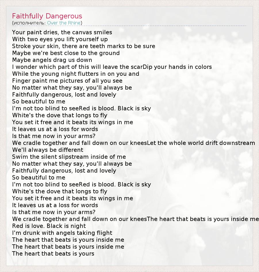 Your paint dries, the canvas smiles With two eyes you lift yourself up Stroke your skin, there are teeth marks to be sure Maybe we're best close to the ground Maybe angels drag us down I wonder which part of this will leave the scarDip your hands in colors While the young night flutters in on you and Finger paint me pictures of all you see No matter what they say, you'll always be Faithfully dangerous, lost and lovely So beautiful to me I'm not too blind to seeRed is blood. Black is sky White's the dove that longs to fly You set it free and it beats its wings in me It leaves us at a loss for words Is that me now in your arms? We cradle together and fall down on our kneesLet the whole world drift downstream We'll always be different Swim the silent slipstream inside of me No matter what they say, you'll always be Faithfully dangerous, lost and lovely So beautiful to me I'm not too blind to seeRed is blood. Black is sky White's the dove that longs to fly You set it free and it beats its wings in me It leaves us at a loss for words Is that me now in your arms? We cradle together and fall down on our kneesThe heart that beats is yours inside me Red is love. Black is night I'm drunk with angels taking flight The heart that beats is yours inside me The heart that beats is yours inside me The heart that beats is yours