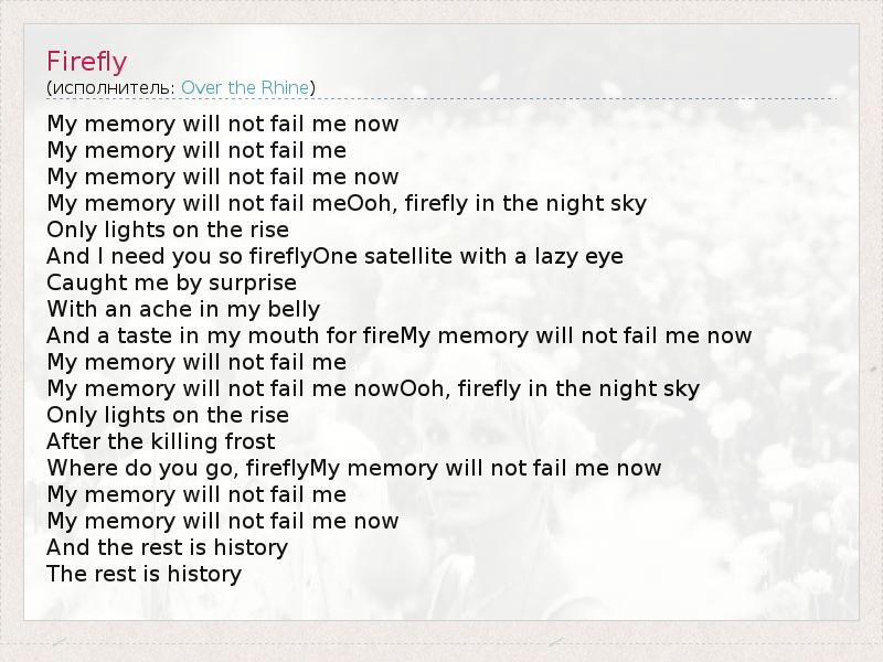 My memory will not fail me now My memory will not fail me My memory will not fail me now My memory will not fail meOoh, firefly in the night sky Only lights on the rise And I need you so fireflyOne satellite with a lazy eye Caught me by surprise With an ache in my belly And a taste in my mouth for fireMy memory will not fail me now My memory will not fail me My memory will not fail me nowOoh, firefly in the night sky Only lights on the rise After the killing frost Where do you go, fireflyMy memory will not fail me now My memory will not fail me My memory will not fail me now And the rest is history The rest is history