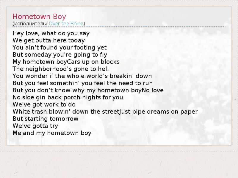 А как ты думаешь, о чем песня "Hometown Boy" ?