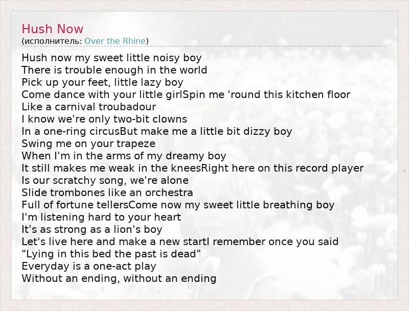 Hush now my sweet little noisy boy There is trouble enough in the world Pick up your feet, little lazy boy Come dance with your little girlSpin me 'round this kitchen floor Like a carnival troubadour I know we're only two-bit clowns In a one-ring circusBut make me a little bit dizzy boy Swing me on your trapeze When I'm in the arms of my dreamy boy It still makes me weak in the kneesRight here on this record player Is our scratchy song, we're alone Slide trombones like an orchestra Full of fortune tellersCome now my sweet little breathing boy I'm listening hard to your heart It's as strong as a lion's boy Let's live here and make a new startI remember once you said "Lying in this bed the past is dead" Everyday is a one-act play Without an ending, without an ending