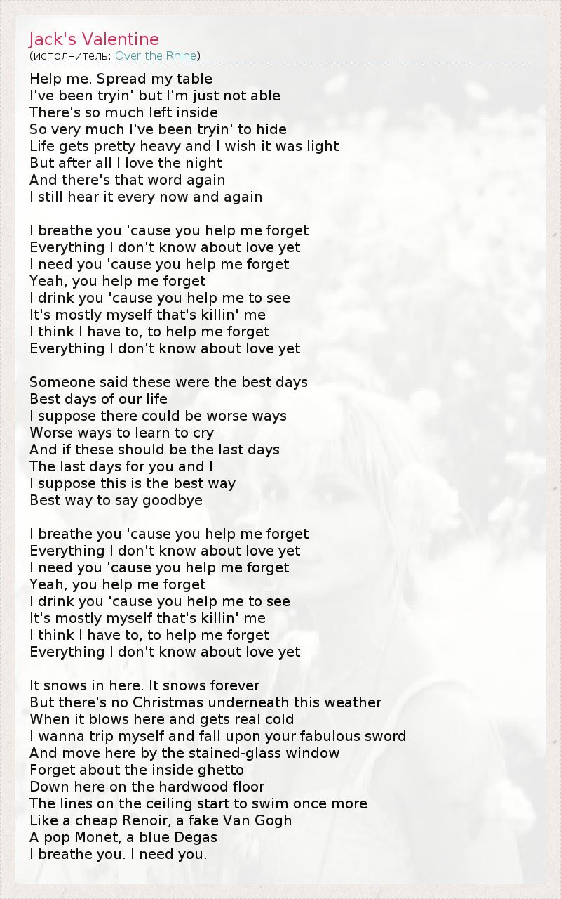 Help me. Spread my table I've been tryin' but I'm just not able There's so much left inside So very much I've been tryin' to hide Life gets pretty heavy and I wish it was light But after all I love the night And there's that word again I still hear it every now and again I breathe you 'cause you help me forget Everything I don't know about love yet I need you 'cause you help me forget Yeah, you help me forget I drink you 'cause you help me to see It's mostly myself that's killin' me I think I have to, to help me forget Everything I don't know about love yet Someone said these were the best days Best days of our life I suppose there could be worse ways Worse ways to learn to cry And if these should be the last days The last days for you and I I suppose this is the best way Best way to say goodbye I breathe you 'cause you help me forget Everything I don't know about love yet I need you 'cause you help me forget Yeah, you help me forget I drink you 'cause you help me to see It's mostly myself that's killin' me I think I have to, to help me forget Everything I don't know about love yet It snows in here. It snows forever But there's no Christmas underneath this weather When it blows here and gets real cold I wanna trip myself and fall upon your fabulous sword And move here by the stained-glass window Forget about the inside ghetto Down here on the hardwood floor The lines on the ceiling start to swim once more Like a cheap Renoir, a fake Van Gogh A pop Monet, a blue Degas I breathe you. I need you.