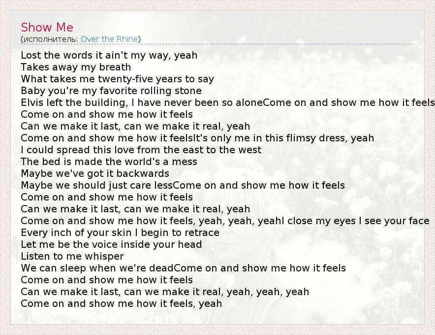 Lost the words it ain't my way, yeah Takes away my breath What takes me twenty-five years to say Baby you're my favorite rolling stone Elvis left the building, I have never been so aloneCome on and show me how it feels Come on and show me how it feels Can we make it last, can we make it real, yeah Come on and show me how it feelsIt's only me in this flimsy dress, yeah I could spread this love from the east to the west The bed is made the world's a mess Maybe we've got it backwards Maybe we should just care lessCome on and show me how it feels Come on and show me how it feels Can we make it last, can we make it real, yeah Come on and show me how it feels, yeah, yeah, yeahI close my eyes I see your face Every inch of your skin I begin to retrace Let me be the voice inside your head Listen to me whisper We can sleep when we're deadCome on and show me how it feels Come on and show me how it feels Can we make it last, can we make it real, yeah, yeah, yeah Come on and show me how it feels, yeah