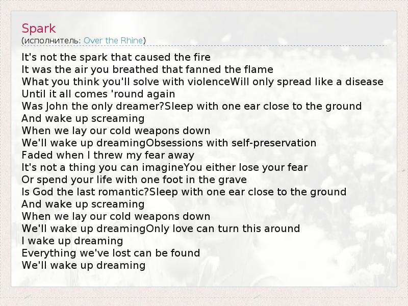 It's not the spark that caused the fire It was the air you breathed that fanned the flame What you think you'll solve with violenceWill only spread like a disease Until it all comes 'round again Was John the only dreamer?Sleep with one ear close to the ground And wake up screaming When we lay our cold weapons down We'll wake up dreamingObsessions with self-preservation Faded when I threw my fear away It's not a thing you can imagineYou either lose your fear Or spend your life with one foot in the grave Is God the last romantic?Sleep with one ear close to the ground And wake up screaming When we lay our cold weapons down We'll wake up dreamingOnly love can turn this around I wake up dreaming Everything we've lost can be found We'll wake up dreaming