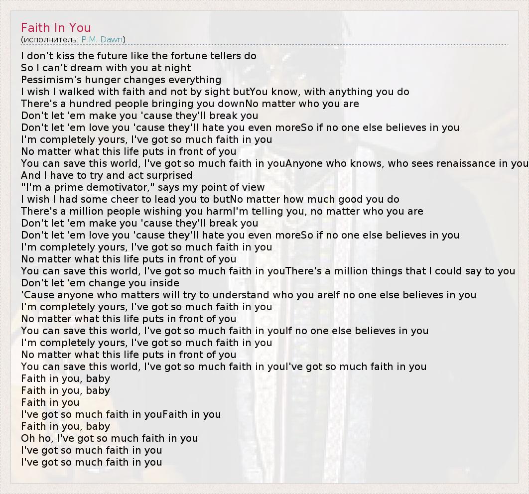 I don't kiss the future like the fortune tellers do So I can't dream with you at night Pessimism's hunger changes everything I wish I walked with faith and not by sight butYou know, with anything you do There's a hundred people bringing you downNo matter who you are Don't let 'em make you 'cause they'll break you Don't let 'em love you 'cause they'll hate you even moreSo if no one else believes in you I'm completely yours, I've got so much faith in you No matter what this life puts in front of you You can save this world, I've got so much faith in youAnyone who knows, who sees renaissance in you And I have to try and act surprised "I'm a prime demotivator," says my point of view I wish I had some cheer to lead you to butNo matter how much good you do There's a million people wishing you harmI'm telling you, no matter who you are Don't let 'em make you 'cause they'll break you Don't let 'em love you 'cause they'll hate you even moreSo if no one else believes in you I'm completely yours, I've got so much faith in you No matter what this life puts in front of you You can save this world, I've got so much faith in youThere's a million things that I could say to you Don't let 'em change you inside 'Cause anyone who matters will try to understand who you areIf no one else believes in you I'm completely yours, I've got so much faith in you No matter what this life puts in front of you You can save this world, I've got so much faith in youIf no one else believes in you I'm completely yours, I've got so much faith in you No matter what this life puts in front of you You can save this world, I've got so much faith in youI've got so much faith in you Faith in you, baby Faith in you, baby Faith in you I've got so much faith in youFaith in you Faith in you, baby Oh ho, I've got so much faith in you I've got so much faith in you I've got so much faith in you