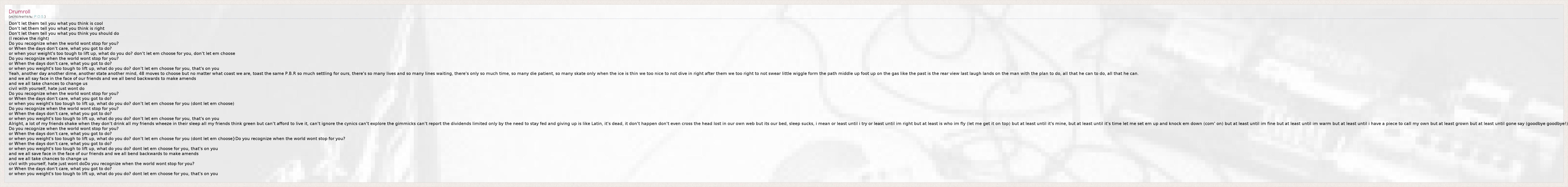 Yeah, another day another dime, another state another mind, 48 moves to choose but no matter what coast we are, toast the same P.B.R so much settling for ours, there's so many lives and so many lines waiting, there's only so much time, so many die patient, so many skate only when the ice is thin we too nice to not dive in right after them we too right to not swear little wiggle form the path middle up foot up on the gas like the past is the rear view last laugh lands on the man with the plan to do, all that he can to do, all that he can.