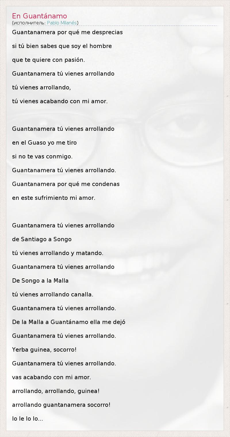 Guantanamera por qué me desprecias si tú bien sabes que soy el hombre que te quiere con pasión. Guantanamera tú vienes arrollando tú vienes arrollando, tú vienes acabando con mi amor. Guantanamera tú vienes arrollando en el Guaso yo me tiro si no te vas conmigo. Guantanamera tú vienes arrollando. Guantanamera por qué me condenas en este sufrimiento mi amor. Guantanamera tú vienes arrollando de Santiago a Songo tú vienes arrollando y matando. Guantanamera tú vienes arrollando De Songo a la Malla tú vienes arrollando canalla. Guantanamera tú vienes arrollando. De la Malla a Guantánamo ella me dejó Guantanamera tú vienes arrollando. Yerba guinea, socorro! Guantanamera tú vienes arrollando. vas acabando con mi amor. arrollando, arrollando, guinea! arrollando guantanamera socorro! lo le lo lo...
