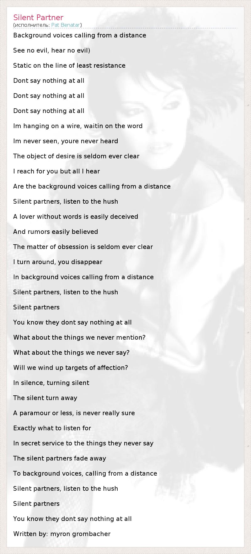 А как ты думаешь, о чем песня "Silent Partner" ?