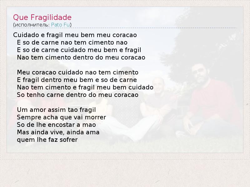 А как ты думаешь, о чем песня "Que Fragilidade" ?