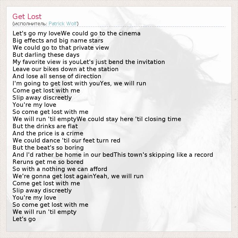 Let's go my loveWe could go to the cinema Big effects and big name stars We could go to that private view But darling these days My favorite view is youLet's just bend the invitation Leave our bikes down at the station And lose all sense of direction I'm going to get lost with youYes, we will run Come get lost with me Slip away discreetly You're my love So come get lost with me We will run 'til emptyWe could stay here 'til closing time But the drinks are flat And the price is a crime We could dance 'til our feet turn red But the beat's so boring And I'd rather be home in our bedThis town's skipping like a record Reruns get me so bored So with a nothing we can afford We're gonna get lost againYeah, we will run Come get lost with me Slip away discreetly You're my love So come get lost with me We will run 'til empty Let's go