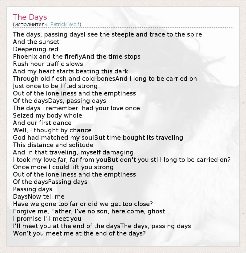 The days, passing daysI see the steeple and trace to the spire And the sunset Deepening red Phoenix and the fireflyAnd the time stops Rush hour traffic slows And my heart starts beating this dark Through old flesh and cold bonesAnd I long to be carried on Just once to be lifted strong Out of the loneliness and the emptiness Of the daysDays, passing days The days I rememberI had your love once Seized my body whole And our first dance Well, I thought by chance God had matched my soulBut time bought its traveling This distance and solitude And in that traveling, myself damaging I took my love far, far from youBut don't you still long to be carried on? Once more I could lift you strong Out of the loneliness and the emptiness Of the daysPassing days Passing days DaysNow tell me Have we gone too far or did we get too close? Forgive me, Father, I've no son, here come, ghost I promise I'll meet you I'll meet you at the end of the daysThe days, passing days Won't you meet me at the end of the days?
