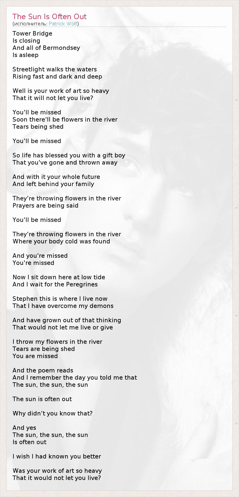 Тауэрский мост 1 Перекрывают, И весь Бермендзи 2 Погрузился в сон. Свет уличных фонарей гуляет по глади воды, Внезапно вздымающейся, тёмной, глубокой. Что ж, твоё произведение искусства как тяжелая ноша, Что не позволяет тебе спокойно жить? По тебе станут грустить, На реку спустят цветы, Уронят слёзы. По тебе станут грустить. Жизнь благословила тебя даром, друг мой, Который ты расточил и отбросил. И с ним вместе всё своё будущее, И свою семью. Они бросают в реку цветы, Они произносят молитвы. Они будут скучать по тебе. Они бросают цветы в реку, Где нашли твоё холодное тело. И они грустят, Им не хватает тебя. И вот, при отливе, я сижу тут И жду, когда прилетят сапсаны. Стивен, теперь тут мой дом, Так я справился со своими демонами. И я перерос все те мысли, Которые не дали бы мне жить или отступиться? И я бросаю в реку цветы, Роняю слезы, И я скучаю по тебе. И читаю стихи, И я вспоминаю день, когда ты сказал, что Солнце, солнце, солнце... Солнце частенько выходит из-за туч. Почему ты не вспомнил об этом? Ведь и правда, Солнце, солнце, солнце Часто выходит из-за облаков. Я хотел бы знать тебя лучше Твоё произведение искусства было как тяжкая ноша, Что не давала тебе жить? 1 - разводной мост в центре Лондона над рекой Темзой, недалеко от Лондонского Тауэра 2 - Район Лондона на юге