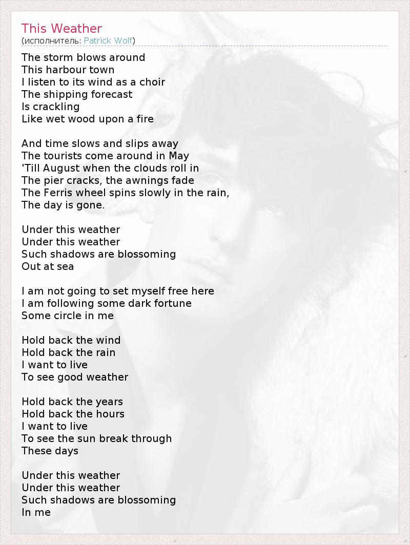 Это интересно:Патрик Вулф (англ. Patrick Wolf, 30 июня 1983, Лондон, Великобритания) — современный британский певец, музыкант и композитор. Настоящее имя Patrick Denis Apps. Играет на большом количестве музыкальных инструментов, в том числе таких как укулеле, фортепиано и альт. Пишет музыку, используя как сэмплы, так и классические музыкальные инструменты. Его стиль варьируется от романтичного фолка до техно-попа.Пи... продолжение