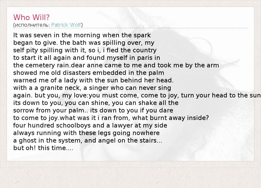 Это интересно:Патрик Вулф (англ. Patrick Wolf, 30 июня 1983, Лондон, Великобритания) — современный британский певец, музыкант и композитор. Настоящее имя Patrick Denis Apps. Играет на большом количестве музыкальных инструментов, в том числе таких как укулеле, фортепиано и альт. Пишет музыку, используя как сэмплы, так и классические музыкальные инструменты. Его стиль варьируется от романтичного фолка до техно-попа.Пи... продолжение