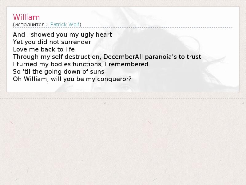 And I showed you my ugly heart Yet you did not surrender Love me back to life Through my self destruction, DecemberAll paranoia's to trust I turned my bodies functions, I remembered So 'til the going down of suns Oh William, will you be my conqueror?