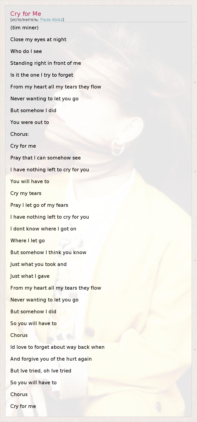 (tim miner) Close my eyes at night Who do I see Standing right in front of me Is it the one I try to forget From my heart all my tears they flow Never wanting to let you go But somehow I did You were out to Chorus: Cry for me Pray that I can somehow see I have nothing left to cry for you You will have to Cry my tears Pray I let go of my fears I have nothing left to cry for you I dont know where I got on Where I let go But somehow I think you know Just what you took and Just what I gave From my heart all my tears they flow Never wanting to let you go But somehow I did So you will have to Chorus Id love to forget about way back when And forgive you of the hurt again But Ive tried, oh Ive tried So you will have to Chorus Cry for me